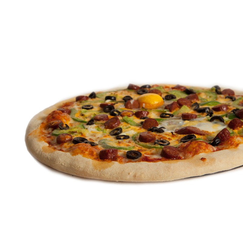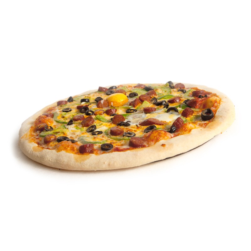 Sauce tomate, mozzarella, poivrons verts, merguez, oeuf