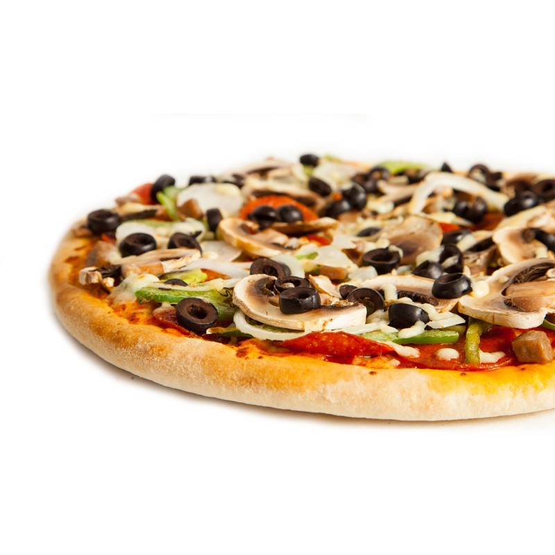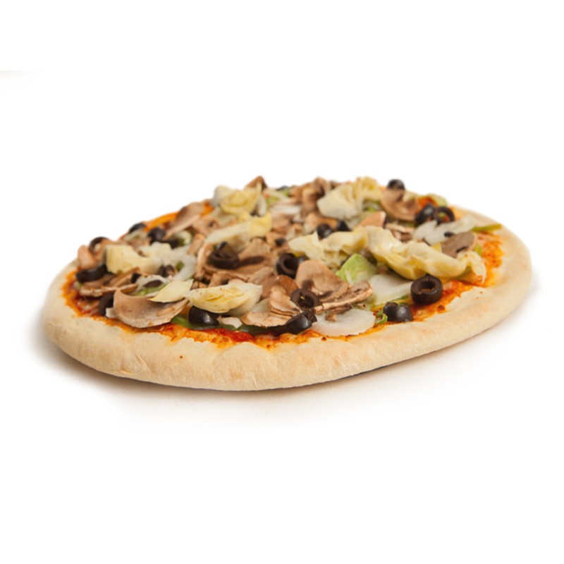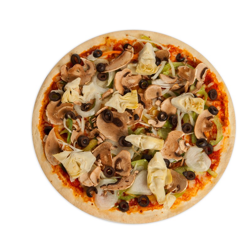 Sauce tomate, double mozzarella, poivrons verts, oignons, champignons, olivre noires, artichauts